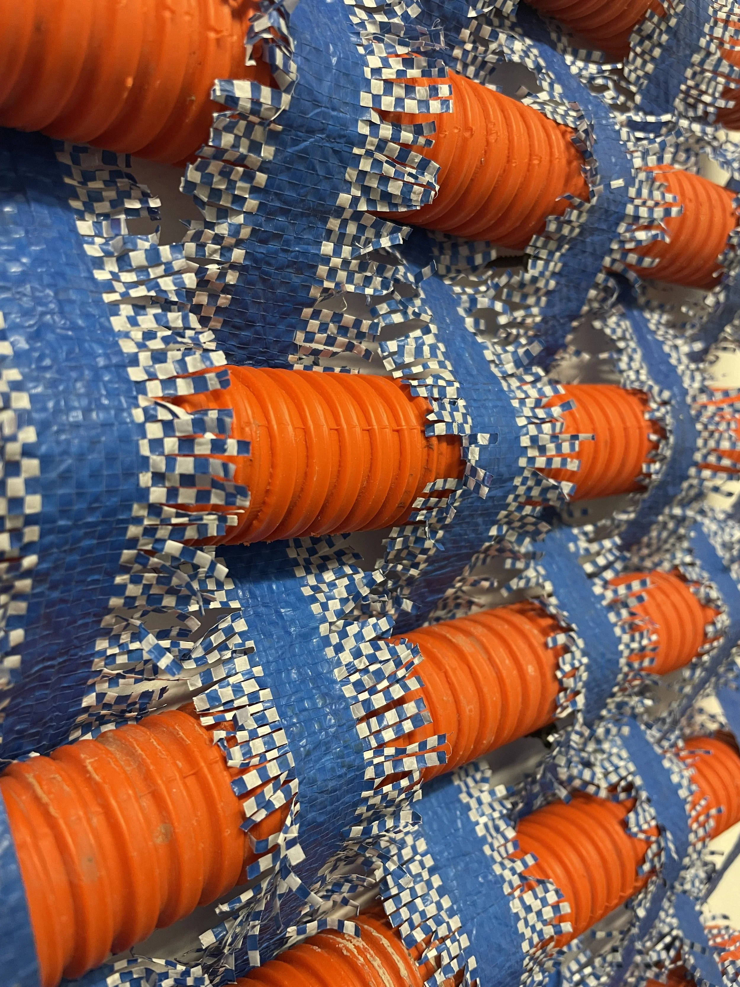 Weaving With Blue Tarp and Orange Electrical Conduit Unraveled Plastic Tarp, Corrugated, Electrical Conduit (All materials are recycled/ repurposed)18” x 12” x 1.5”